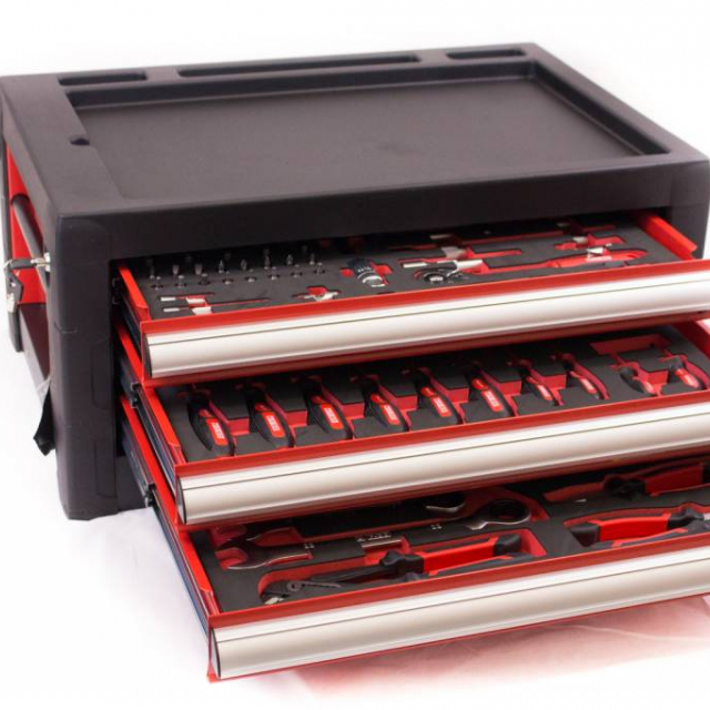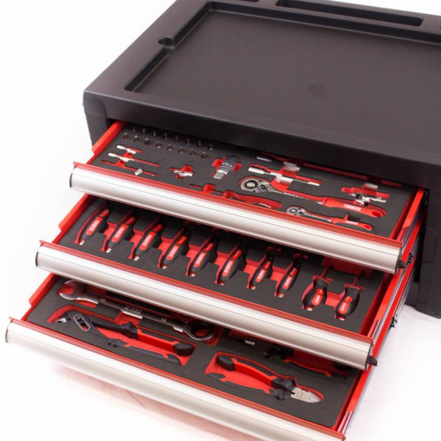 Aan de zijkant van de gereedschapskist zit er een gatenbord,dat is erg handig voor het ophangen van uw gereedschap.U heeft hierdoor altijd het juiste gereedschap bij de hand. De lades hebben een afmeting van 55 x 39,5 x 6 cm en zijn volledig uitrekbaar. Alle lades zijn door middel van de meegeleverde sleutel op slot te zetten. Aan de bovenzijde van de kist is er plek voor gereedschap, bouten of moeren. Het plateau bestaat uit 3 ruimtes met verschillende formaten en is ook te gebruiken als werkblad.Kortom, deze gereedschapskist beschikt over allerlei snufjes die handig zijn voor het klussen. De topkist van Ragnor is ook uit te breiden met één van de Ragnor gereedschapswagens. Deze gereedschapskist wordt inclusief gereedschap geleverd.
