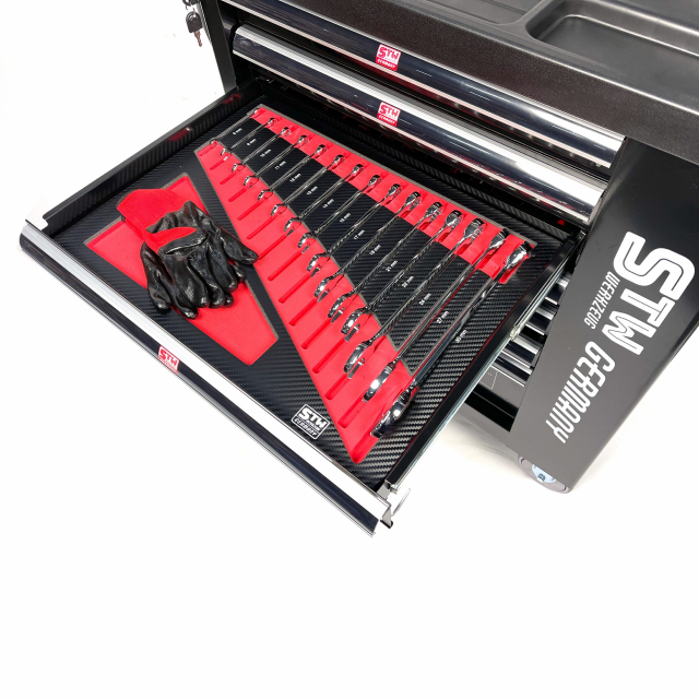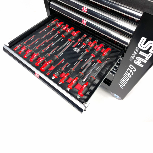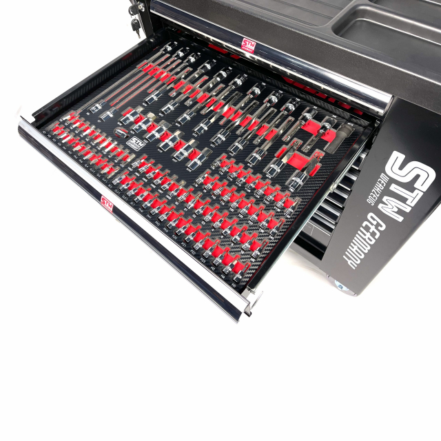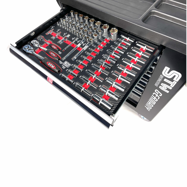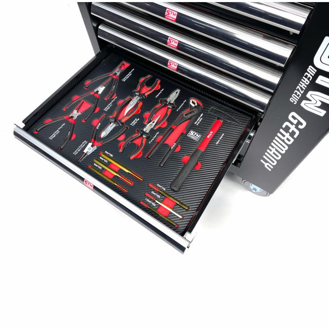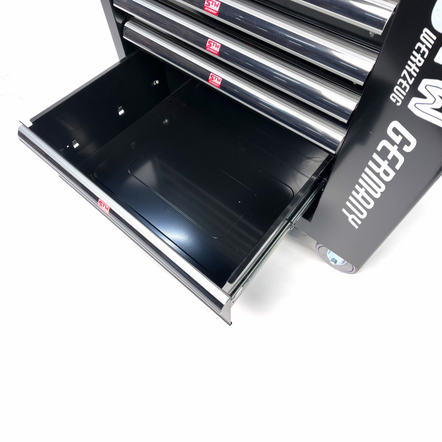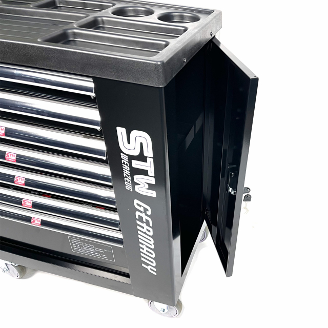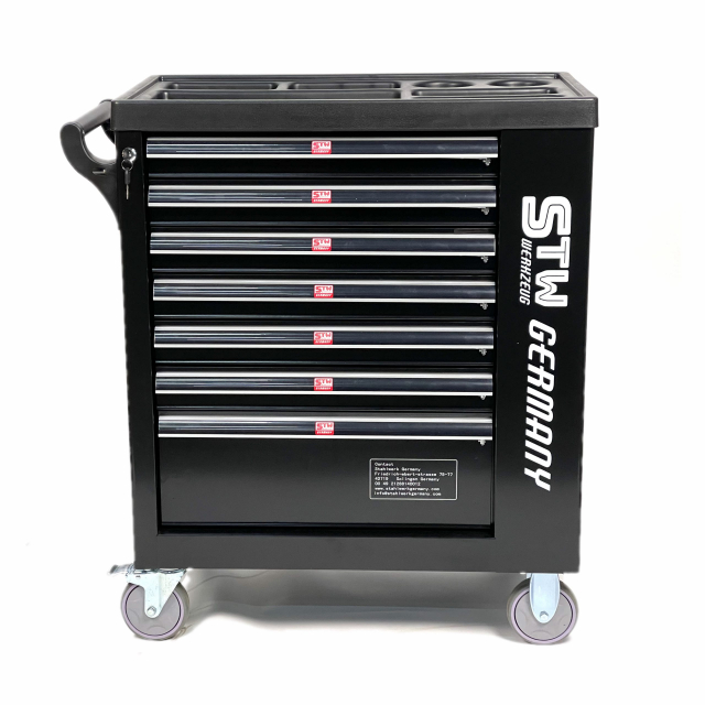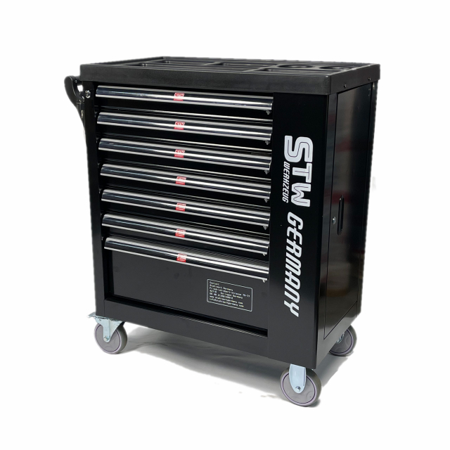 Deze STW gereedschapswagen bij Stahlwerk beschikt over zeven kogelgelagerde laden waarvan 6 gevulde laden met gereedschap.