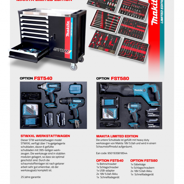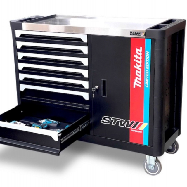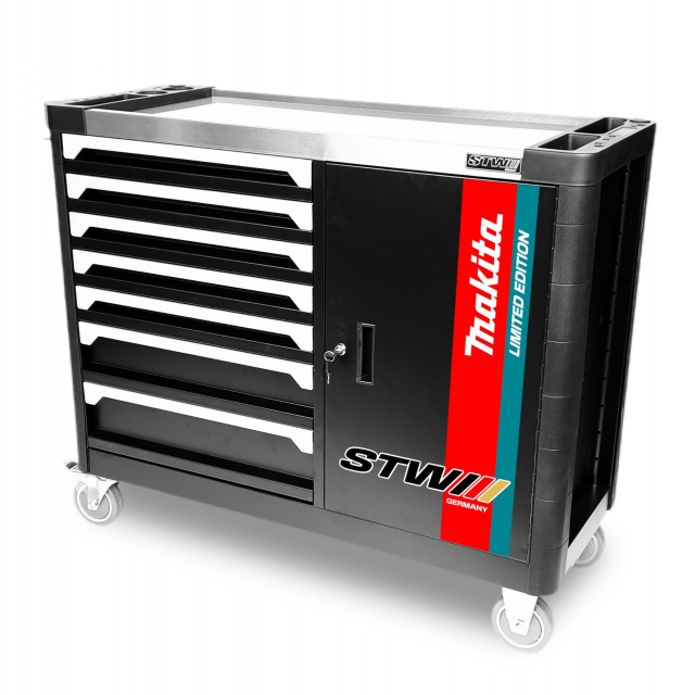 Deze STW XXL gereedschapswagen bij Stahlwerk beschikt over zeven kogelgelagerde laden waarvan 6 gevulde laden met gereedschap. Het gereedschap zit opgeborgen in zes stevige schuimrubberen modules waardoor deze optimaal beschermd zijn. Door middel van de foam inlays kunt u na de werkzaamheden erg simpel zien of de gereedschapsset compleet is. Deze gereedschapswagen is simpel verplaatsbaar door de stevige stuurgreep en de robuuste vier wielen waarvan twee zwenkwielen met rem. Deze gereedschapswagen is geheel afsluitbaar door middel van 2 sleutels passend op het cilinderslot. De wagen beschikt over een extra sterk roestvrijstaal bovenblad.