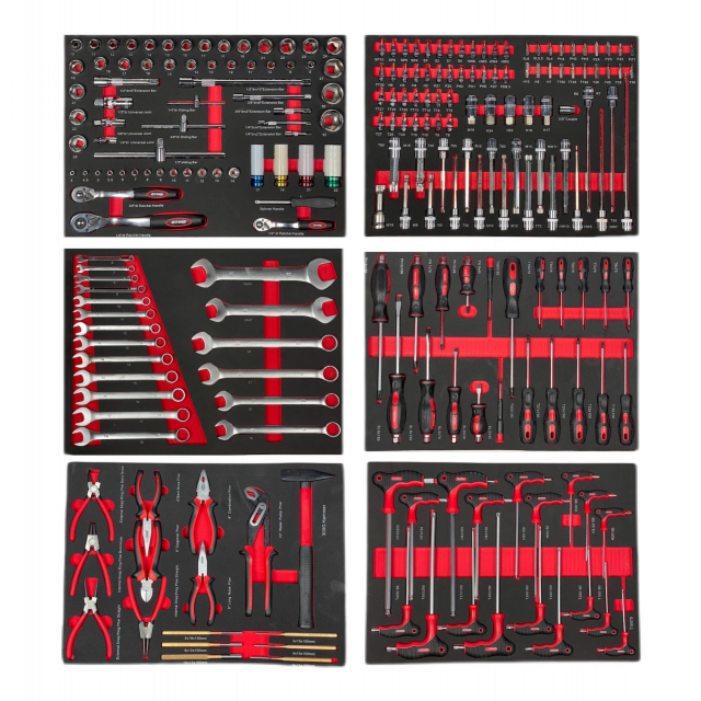 In deze gereedschapswagen vindt u een uitgebreid 295-delig gereedschapset met onder andere een compleet doppenset met ratels in drie verschillende opnames: 1/2″, 1/4″ en 3/8″. De schroevendraaiers in deze gereedschapswagen zijn van professionele kwaliteit en op de kop voorzien van een zeskant voor extra kracht te zetten met een sleutel of hamer.