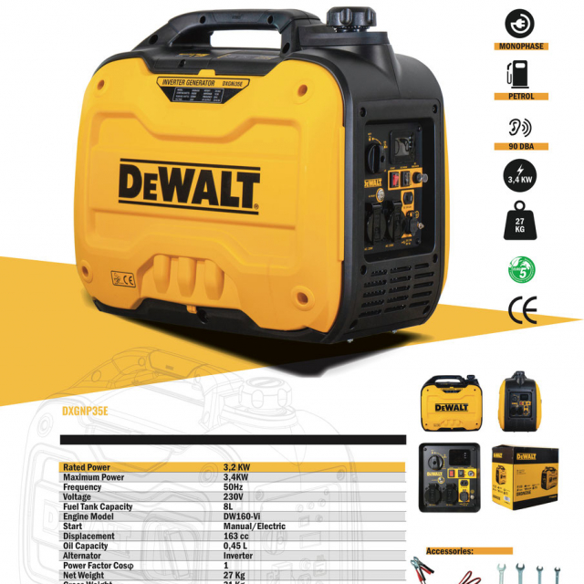 De DEWALT inverter power generator benzine 3400Watt DXGNi35E is een krachtige en betrouwbare generator voor gebruik in een breed scala aan toepassingen. Met een nominaal vermogen van 3200 watt en een piekvermogen van 3400 watt biedt deze generator voldoende energie voor de werking van apparaten en gereedschappen op bouwplaatsen, op de camping of voor noodgevallen.
