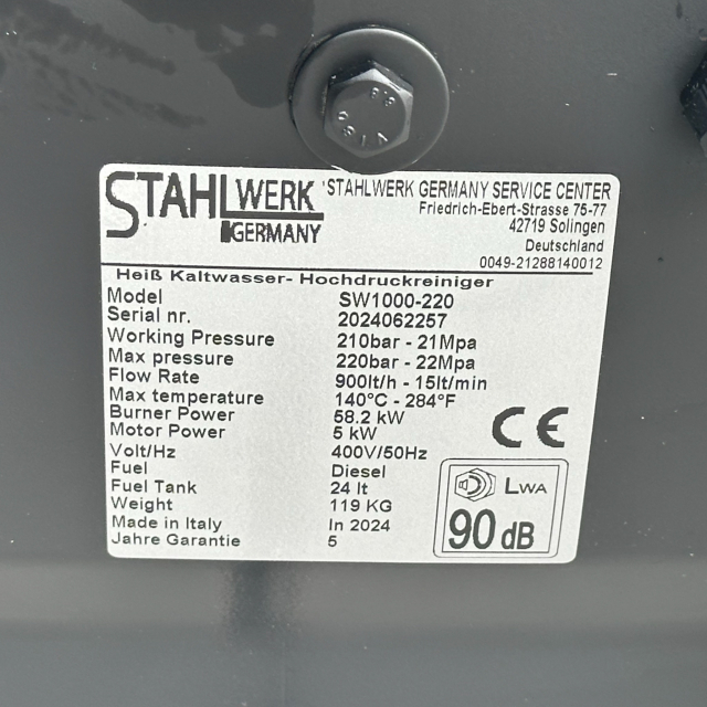 De Stahlwerk Germany SW1000-220 Heetwater Hogedrukreiniger is de perfecte keuze voor professionals die op zoek zijn naar een krachtige, efficiënte en betrouwbare oplossing voor hun reinigingsbehoeften.